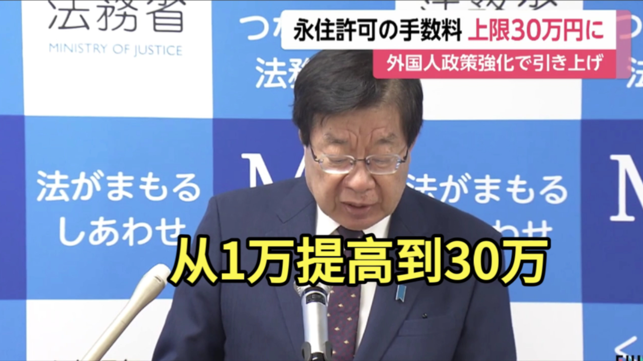 目前,日本法律規定,外國人在辦理再留手續時的費用上限為1萬日元。根據修正案,在留資格變更和在留期限更新的手續費上限將提高到10萬日元,而申請永住許可的手續費上限則提升至30萬日元。據悉,這是日本政府1982年以來首次提高上限。該法案將提交本屆國會,若獲得通過將力爭在2028年度內啟用。