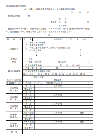 在獨自生活的老年人家中設置感應器,當感應器無法感應到使用者時,會有指定人員上門確認安危。該網絡主要針對于80歲以上的老人,或有嚴重心臟病等障礙癥的人,以及70歲以上對身體感到不安的人。在老人家中安裝感應設備后,通過有線電視網絡將感應信息發送到社會福利部門集中管理,以確認使用者是否安全。對于4點到9點之間的5小時內沒有信息反饋的房子,將由附近指定的合作者(事先登記3人)確認安危,設備的安裝費用可由市里報銷。