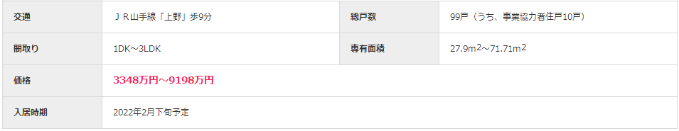 上野地區幾乎沒有新房供應,距JR山手線上野車站步行9分鐘,有一幢將在2022年竣工的新建公寓,面積為27.9-71.71㎡,戶型為1DK-3LDK的房間,售價是3348-9198萬日元。