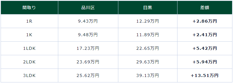 目黑站因?yàn)榄h(huán)境很宜居,相應(yīng)的房租行情也非常高。將目黑站所在的品川區(qū)內(nèi)的平均房租和距目黑站步行10分鐘以?xún)?nèi)的房租行情進(jìn)行比較。