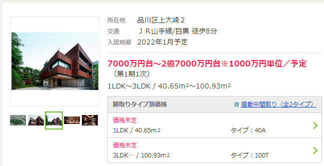 來(lái)看具體物件,距目黑站步行8分鐘左右,2022年1月交房,面積為40.65㎡-100.93㎡的1LDK-3LDK的新建公寓項(xiàng)目,房?jī)r(jià)約為7000萬(wàn)-2億7000萬(wàn)日元。