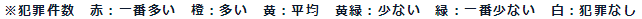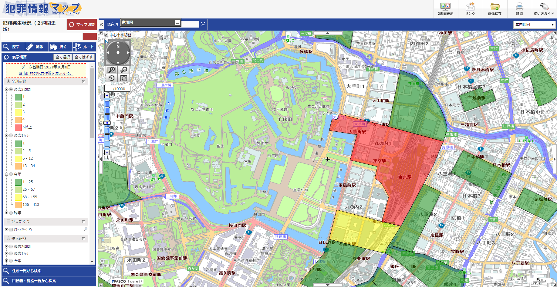 東京站車流量人流量過大,治安也相對不好。 以下地圖為警視廳發布的“犯罪信息地圖”,車站周邊治安情況按顏色區分: