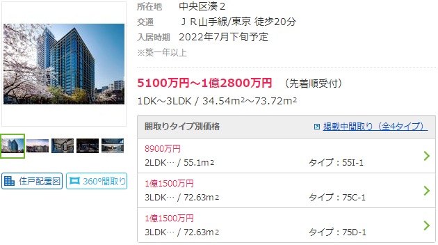 東京站附近的新建公寓項目房源較少,目前距車站步行20分鐘,面積為34.54㎡-73.72㎡的1DK-3LDK戶型售價為5100萬-1億2800萬日元,暫定2022年7月入住。