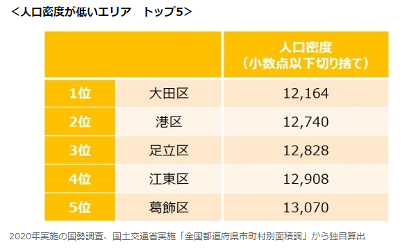 排名第一的大田區其實人口數量也不少,不過因為區域面積較大,人口密度相對較低。而擁有眾多高級公寓項目及大企業總部所在的港區,竟然排在第二名,這個就比較意外了,其實這主要與港區內商業地產較多,房價及租金較高,單身人口大多居住在區外有關。其次是足立區,江東區及葛飾區。