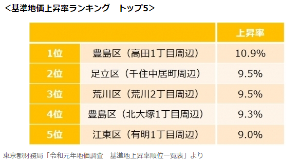 與此同時,多個區(qū)域受正在進行再開發(fā)建設(shè)、新增設(shè)電車線路的始發(fā)站等因素影響,還導致部分地價上漲明顯,與2019年度相比,23區(qū)基準地價漲幅排行榜前5位如下: