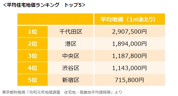 東京23區(qū)平均住宅地價排行榜前5位如下:
