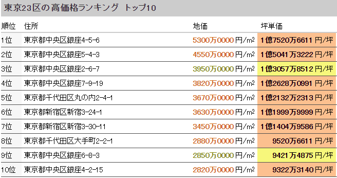 東京23區內地價排名前10位的價格高地如下: