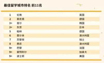 根據全球高等教育和商科教育研究機構(Quacquarelli Symonds) 發布的2022年世界最佳留學城市排名中,應該倫敦常年位列第一,其次是德國慕尼黑屈居第二,韓國首爾和日本東京并列第三,其中東京也是多年排名榜單前三名。