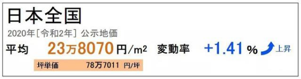 根據(jù)日本全國公示的地價,2020年日本全國公示地價為平均23萬8070日元/㎡,上漲了1.41%。東京于2020年的土地價格相較于2019年有4.24%的漲幅,同時東京的地價已連續(xù)5年呈上漲趨勢。