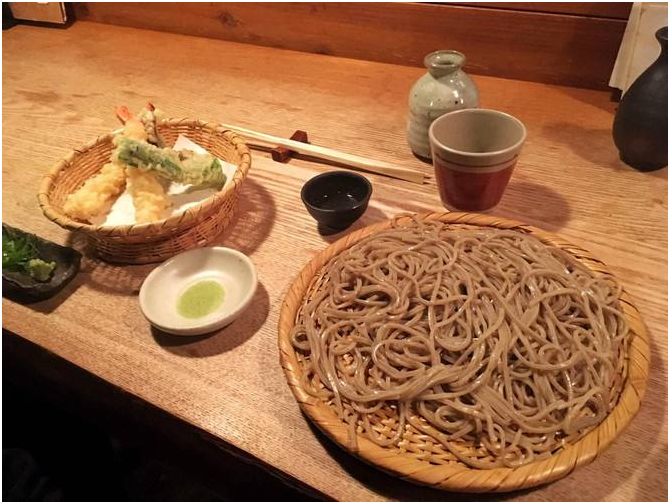 煮熟的蕎麥面瀝水后通常用竹器盛放,蘸著茶碗中的醬油汁食用,當然也可以配以不同的天婦羅佐餐。吃完蕎麥面后,最后茶碗中剩下的一點醬汁可以加入熱面湯和蔥花,調制成醬油湯趁熱喝下去,口味也是極佳的。