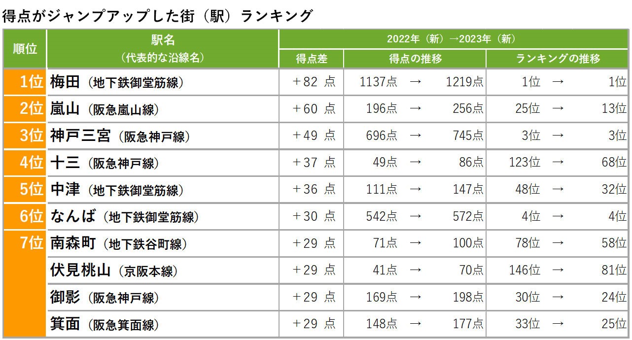 例如神戶三宮(+49分,從第3位升至第3位)、十三(+37分,從第123位升至第68位)、中津(+36分,從第48位升至第32位)等,顯示出都市中心受關注度的高度。
