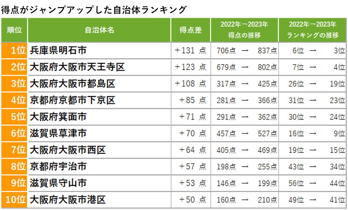 第一名仍然是“兵庫縣西宮市”,第二名是“大阪府大阪市北區”,第三名是從去年的第6位大幅提升的“兵庫縣明石市”,得分也比去年增加了131分,是所有自治體中得分增長最多的。