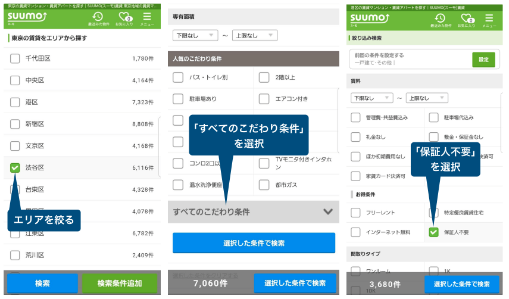 想找到無需保證人或保證會(huì)社的房子時(shí),可以請(qǐng)房屋中介幫忙推薦合適的房源,或者在homes或suumo等租房網(wǎng)站上搜索,勾選相應(yīng)的租房條件即可。