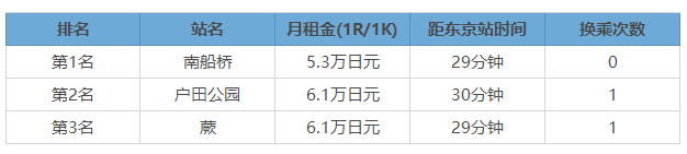 那么在東京圈里,距離東京站30分鐘以內(nèi),在哪里租房的性價比最高呢?經(jīng)過網(wǎng)絡(luò)投票,2021年的前三名如下表,南船橋依然穩(wěn)坐第一的位置。