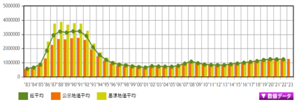 從1983年(昭和58年)開始的40年數(shù)據(jù)中,公示地價(jià)的最高值為每平方米273萬(wàn)5360日元(1991年),最低值為每平方米54萬(wàn)7383日元(1983年),兩者的落差為5.00倍。基準(zhǔn)地價(jià)的最高值為每平方米386萬(wàn)4123日元(1988年),最低值為每平方米59萬(wàn)4797日元(1983年),兩者的落差為6.50倍。