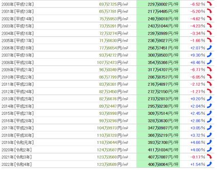 基準(zhǔn)地價(jià)平均為每平方米126萬(wàn)6073日元(2022年),每坪418萬(wàn)5367日元,與前一年相比增長(zhǎng)了+2.38%。
