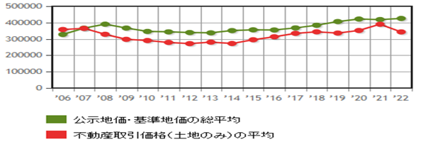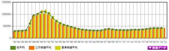 在實際進行的江戶川區房地產交易中,國土交通省僅計算了不包括建筑物(例如大樓或房屋)的土地銷售交易的平均價格。由于這些是來自實際房地產交易的價格,它們是接近市場價格的數字。在2022年(令和4年)第一季度中,江戶川區的土地交易價格按每平方米計算為34萬3125日元/平方米,按每坪計算為113萬4297日元/坪,地價與去年相比下降了-12.00%。這個平均交易價格與公示地價和基準地價的平均值相比,有一個-19.37%的差距。