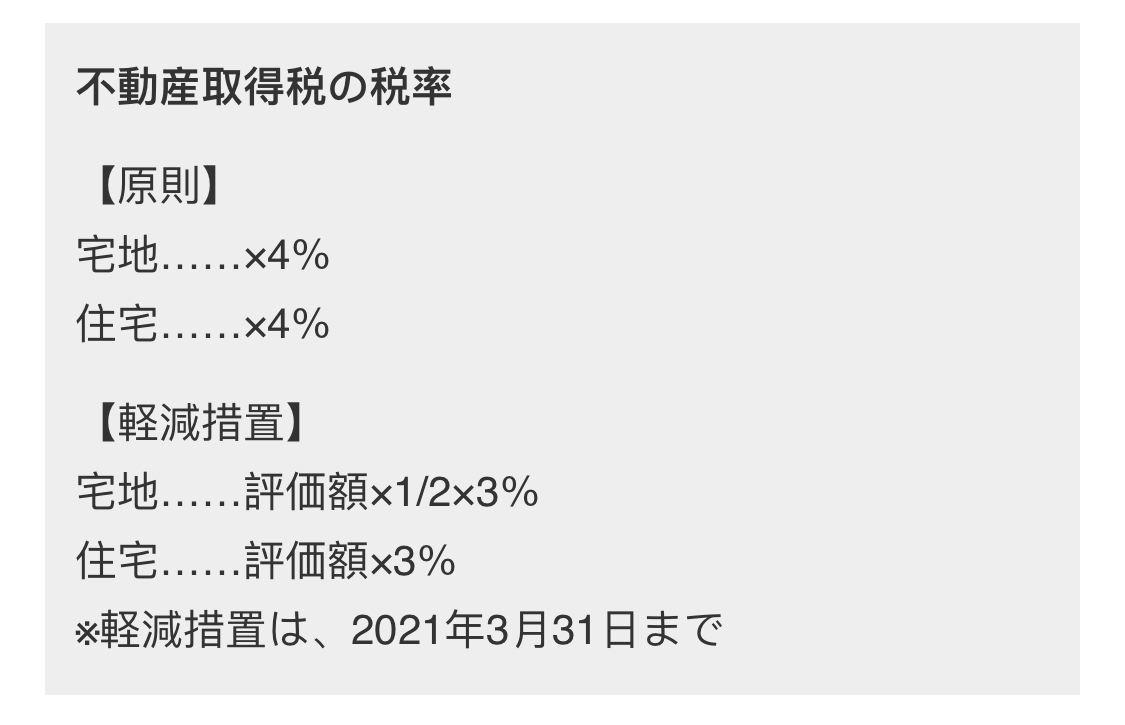 不動產(chǎn)取得稅是指購買了土地和建筑物后所需要繳納的稅金。 您購買房產(chǎn)后不久,地稅局就會發(fā)來納稅通知書。您需要到當?shù)氐亩悇帐聞账k理納稅手續(xù)。不動產(chǎn)取得稅的稅額按“課稅標準額×稅率”計算。課稅標準額指的是法律上購買房地產(chǎn)的價格。但是在實際業(yè)務中并不是按實際買賣價格計算的,原則上使用的是被稱為固定資產(chǎn)稅評估額(以下稱為評估價格)的公共價格。 這個評估價格通常低于交易價格,土地的評估額為交易價格的7成左右,建筑物的評估額為5~6成左右。稅率原則上是4%,但土地和住宅在2021年3月31日取得之前被下調3%。這個下調沒有特別的必要條件,只要是土地或者住宅就可以。另外,對于與宅地和宅地同樣受到處理的土地,到2021年3月31日為止,評價額的二分之一為征稅標準額。