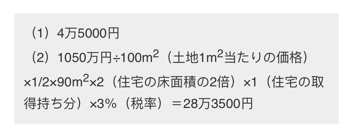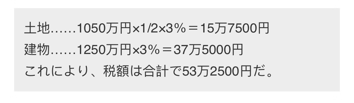 首先,減免前的稅額,將土地的評價值減半,建筑物評價值乘以稅率(3% )。