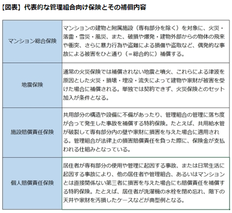作為管理工會保險代表的公寓綜合保險,可以由以上4種保險組成,即公寓綜合險、地震保險、設施賠償責任保險、個人賠償責任保險。保險中的特別約定不僅賠付物品的損失,還可以賠付對人員造成的傷害。比如,意外的“高空墜物”使一樓的過路人(非居民)受傷。 這種情況下,如果加入了個人賠償責任保險的話,這類因居住者日常生活引起的事故,造成了與公寓沒有直接關系的第三者人員傷害的情況下也會給與損失賠償,有效緩解因此而帶來的糾紛,減輕居住者的負擔。