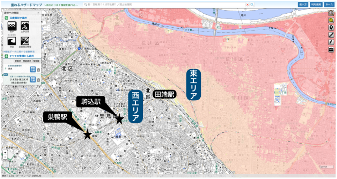 由上圖可以看出,田端站的整個東部區域都有“1m~5m”浸水的風險,是否真的要住在田端?如果在附近找到了喜歡的房子,建議選擇2層以上的房間居住比較安全。如果擔心的話,也可以考慮一下附近水災風險較低的“駒込站”和“巢鴨站”等車站吧