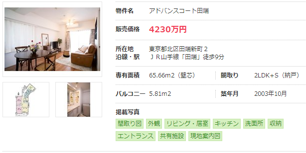 距離JR山手線田端站步行9分鐘,面積為65.66㎡,于2003年竣工的2LDK的二手房售價為4230萬日元。