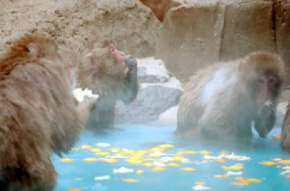 當天,動物園將4公斤左右的柚子投入在34度的熱水浴池中后,柚子清爽的香氣便隨著熱氣飄散開來,吸引了猴子們的矚目,紛紛過來吃袖子并泡湯。