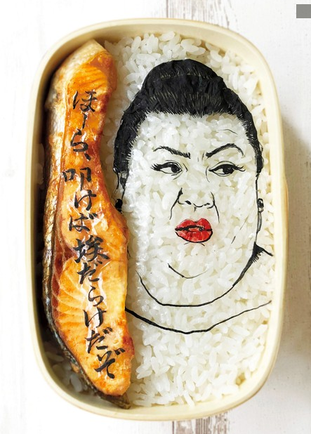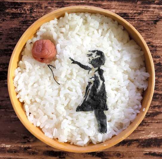親自動手制作藝術便當的是廣島縣東廣島市的設計師松浦美喜(56歲),她每天都會為丈夫和兒子制作便當。自2017年其兒子步入社會就職后,松浦美喜的時間和經濟方面就都寬裕了起來。從這時起,她就開始在Instagram上發布時尚便當的照片,最開始制作的是英國匿名藝術家班克西(Banksy)的作品,其中的紅色氣球用梅干來表現,少女則是將食用炭溶于水后用筆畫在糯米紙上,糯米紙在大米的蒸氣下自然溶化而形成的。