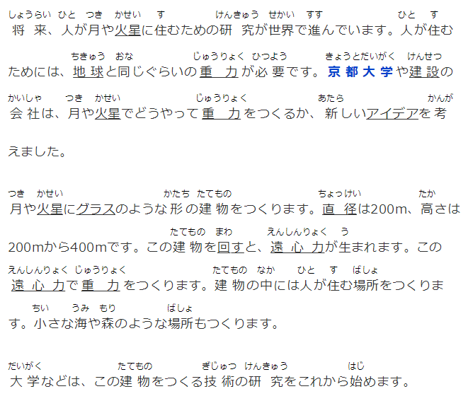 將來、人が月や火星に住むための研究が世界で進んでいます。人が住むためには、地球と同じぐらいの重力が必要です。京都大學や建設の會社は、月や火星でどうやって重力をつくるか、新しいアイデアを考えました。