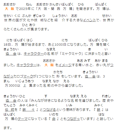 大阪で2025年に「大阪?関西萬博」を開きます。萬博は、世界の國が文化や技術などを紹介する大きなイベントで、世界からたくさんの人が集まります。