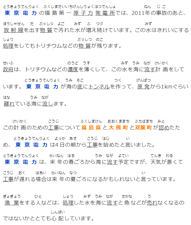 この計(jì)畫のための工事について福島県と大熊町と雙葉町が認(rèn)めたため、東京電力は4日の朝から工事を始めたと言いました。東京電力は、來年の春ごろから海に流す予定ですが、天気が悪くて工事が遅れる場合は來年の夏ごろになるかもしれないと言っています。