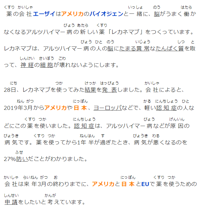 28日、レカネマブを使ってみた結果を発表しました。會社によると、2019年3月からアメリカや日本、ヨーロッパなどで、軽い認知癥の人などにこの薬を使いました。認知癥は、アルツハイマー病などが原因の病気です。薬を使ってから1年半が過ぎたとき、病気が悪くなるのを27%防いだことがわかりました。