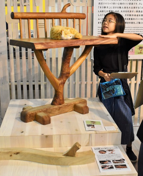 借本屆木工節之機,又新有5家公司參與進來制作貓咪家具,其中2家的制品為非賣品。這是大川木工節首次對貓咪家具進行集中展示。家住北九州市小倉南區、家中飼養著6只貓咪的松島幸子,為了參觀貓咪家具,一家三口舉家來到會場。她表示“雖然價格高昂,但(貓咪)同樣是生命,同樣是家人。感覺就算忍著不為自己買東西,也想要買給貓咪。”