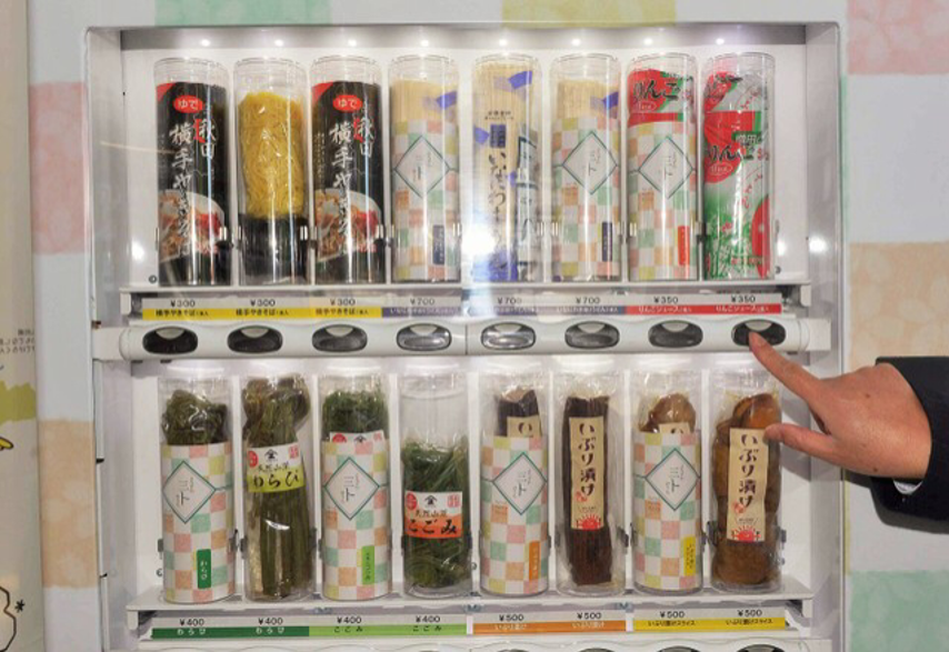 日前,一臺販賣日本秋田縣橫手市的特產橫手炒面、白蘿卜熏干后腌制的“Iburi咸菜(日文為:いぶり漬け)”、蘋果汁等的自動販賣機在橫手站亮相。